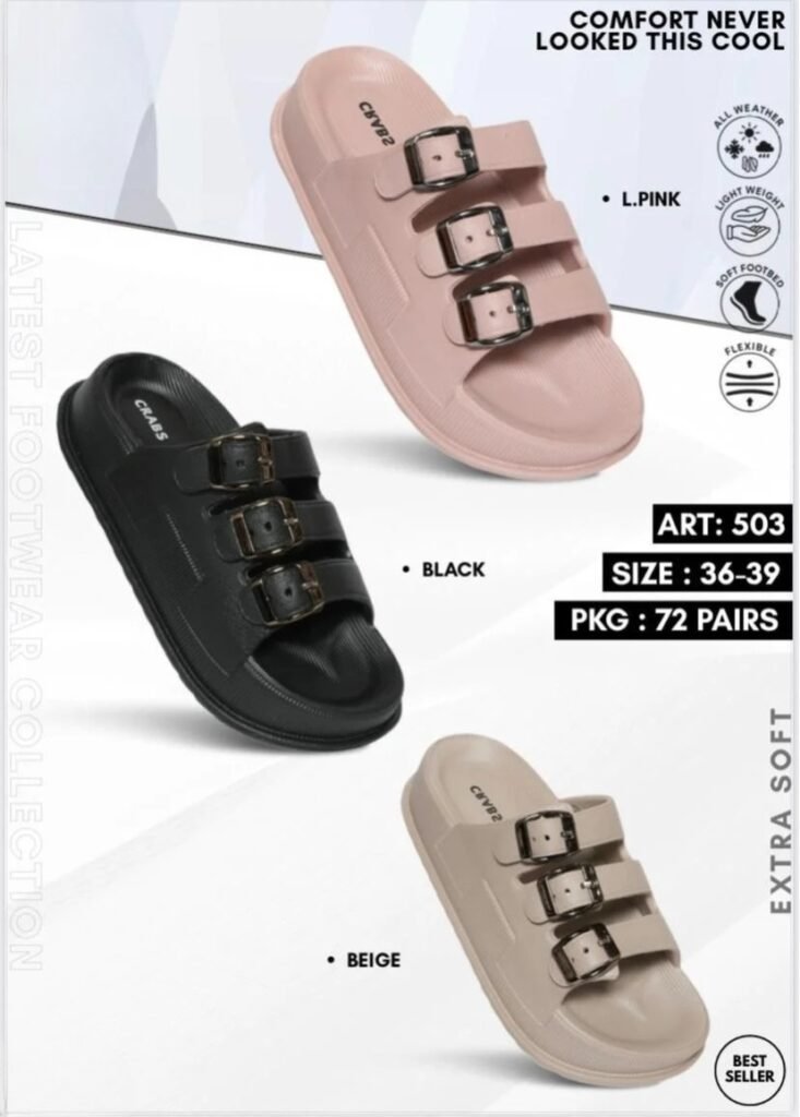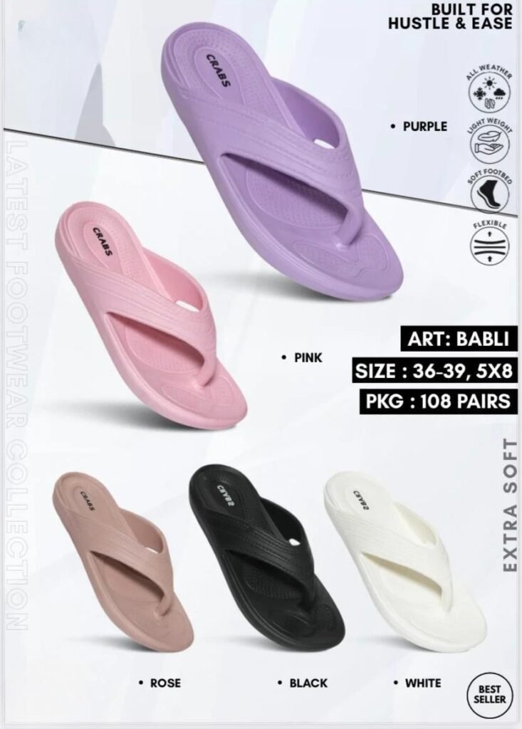 Our women’s footwear collection is thoughtfully designed to combine style, comfort, and durability for everyday wear. Crafted using premium EVA and PU materials, our slippers are lightweight, flexible, and gentle on the feet, making them ideal for long hours of use. With soft cushioning, ergonomic design, and trendy finishes, our women’s footwear offers reliable comfort without compromising on looks. Suitable for daily, casual, and all-weather use, each pair reflects Vinayak Polymers’ commitment to quality and comfort-driven design.